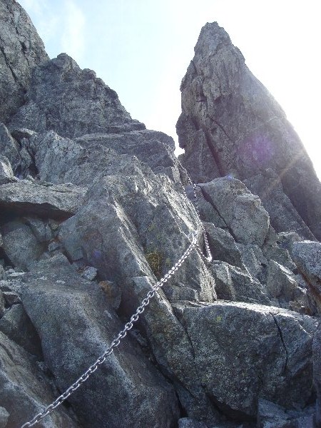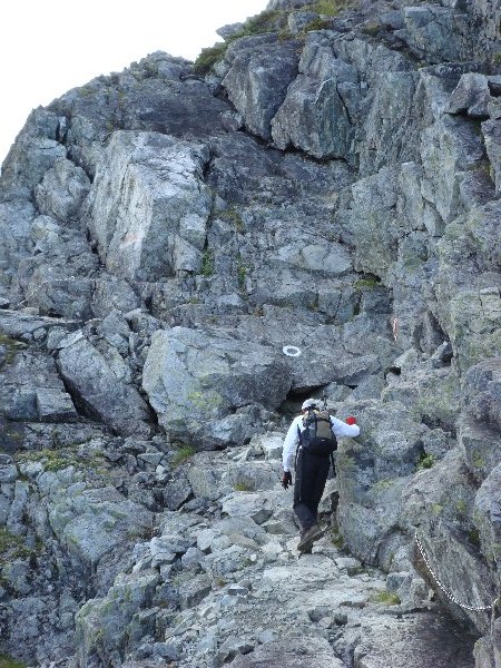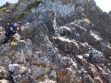 | (6:54) まだまだ余裕な表情 | (7:01) いよいよ核心部へ。まずは獅子頭の岩場。ペンキの矢印通りに進めば特に問題ない。 | (7:02) 呼吸を整えて、 | (7:02) クサリ場を進みます。既に山頂には人影が。 |