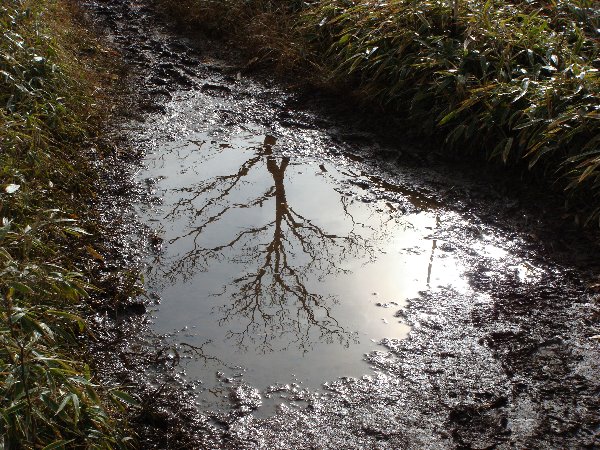 | (9:10) 宮ヶ瀬湖方面 | (9:13) 水溜りに映った木。なんとなく撮ってみた。 | (9:14) 蛭ヶ岳方面を振り返るその1 | (9:15) 蛭ヶ岳方面を振り返るその2 |